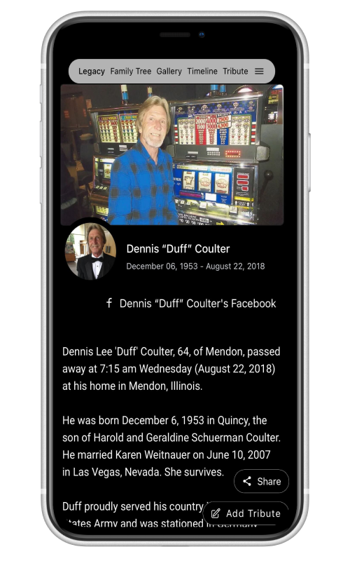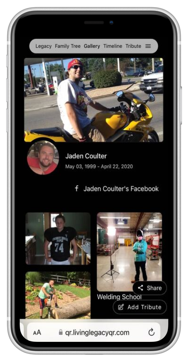 Create and preserve your loved one’s legacy hassle free. Share photos, videos, memories, music, family information and more with each scan of our Living Legacy QR medallion or each share of our Living Legacy memorial page